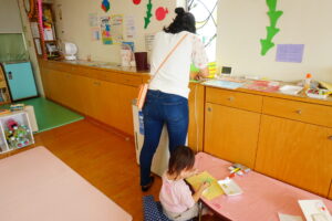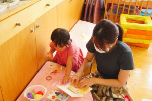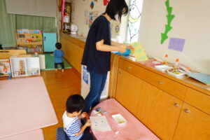 1才8ヶ月の子は、お母さんと一緒にのりを使ってカード作りをしています(^^♪