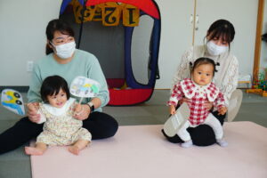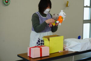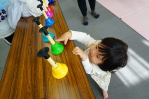 中身は、おもちゃに・・・ハンドベル!興味津々のお友達(^^)